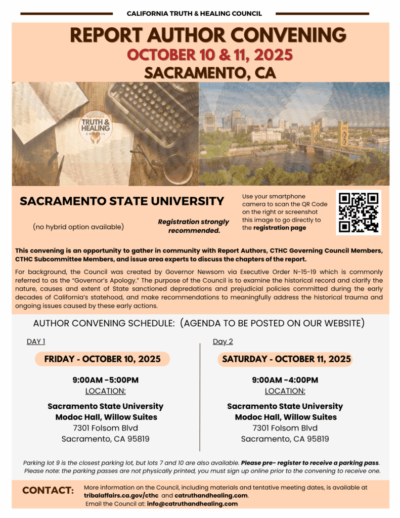 The California Truth & Healing Council, created by Governor Newsom via Executive Order N-15-19, bears witness to, records, examines existing documentation of, and receives California Native American narratives regarding the historical relationship between the State of California and California Native Americans in order to clarify the historical record of such relationship in the spirit of truth and healing. The Council is led and convened by the Governor’s Tribal Advisor and governed by a Governing Council of California Native American leaders, and may include additional non-voting representatives from California Native American tribes, relevant state and local agencies, and other relevant non-governmental stakeholders.